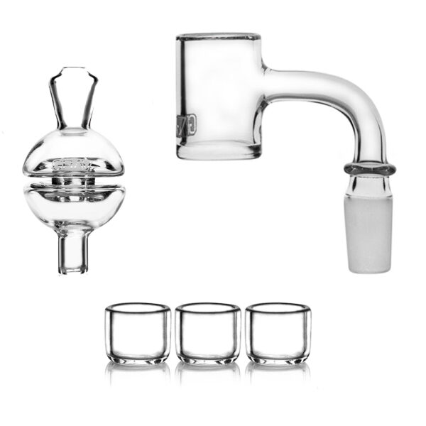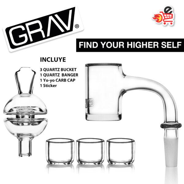Kit – Banger GRAV de Quarzo de 90 grados Junta Macho a elegir de 10mm o 14mm, con 3 insertos o Buckets y un Yo-Yo Carb Cap,