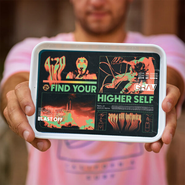Con nuestra obra de arte exclusiva "Find Your Higher Self", esta bandeja es una pieza llamativa que aporta un toque de estilo retro al ritual de fumar. Mide 7,5 pulgadas por 5,5 pulgadas, es compacto y fácil de almacenar.